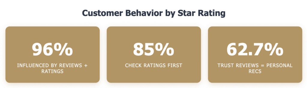 Average star ratings influence every stage of the customer journey, from initial research to final purchase decisions. The table below quantifies the behavioral impact of different rating levels.